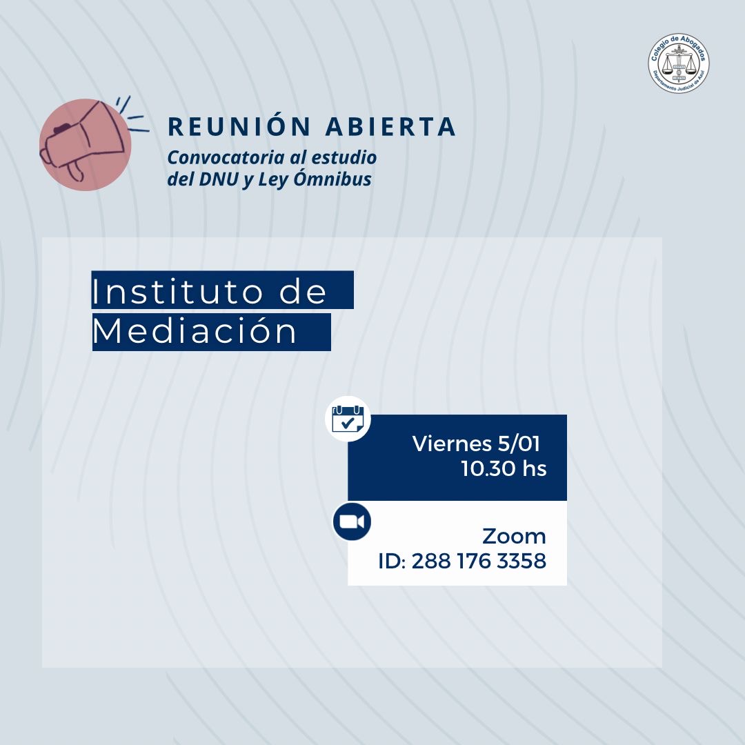 Instituto de Mediación: Viernes 5 de enero a las .10 30 horas Modalidad virtual mediante sistema Zoom. ID: 288 176 .3358