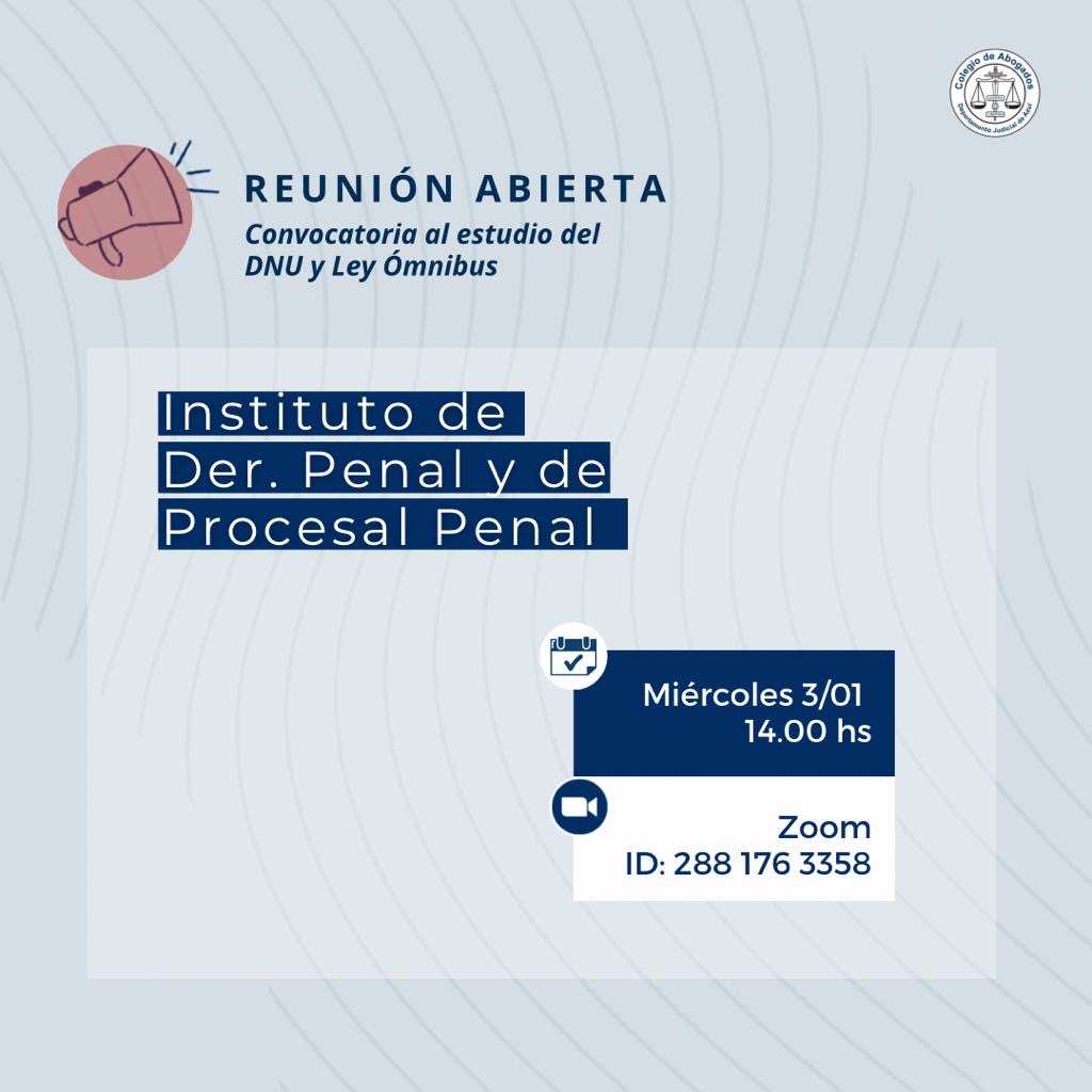 Martes 2 de Enero de 2024. Convocatoria abierta para analizar el DNU y el Proyecto de Ley Ómnibus presentados por el Ejecutivo. Desde los Institutos Académicos del Colegio se convoColegio de Abogados del Departamento Judicial de Azul matriculados/as interesados/as a participar de reuniones donde se trabajará exhaustivamente en el análisis de ambos documentos. . Esta semana se reúnen el Instituto de Derecho de Familia y el Instituto de Derecho Penal y Procesal Penal. Los detalles: