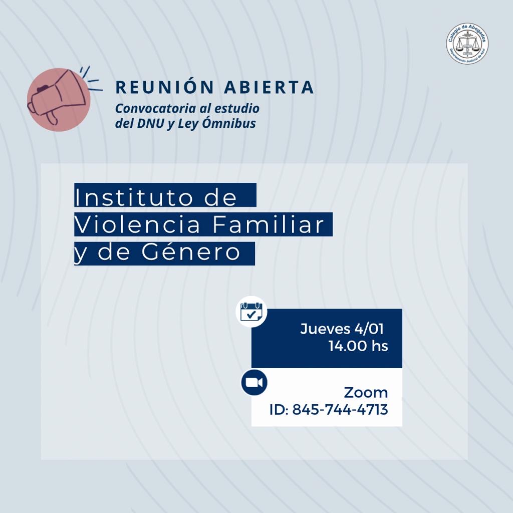 Instituto de Violencia Familiar y de Género: Jueves 4 de enero a las 14 horas Modalidad virtual mediante sistema Zoom. ID: 845 744 .4713