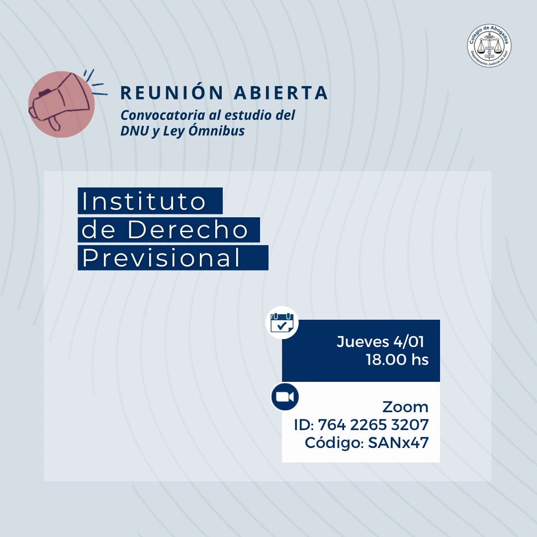 Instituto de Derecho Previsional: Jueves 4 de enero a las 18 horas Modalidad virtual mediante sistema Zoom. ID: 764 2265 .3207