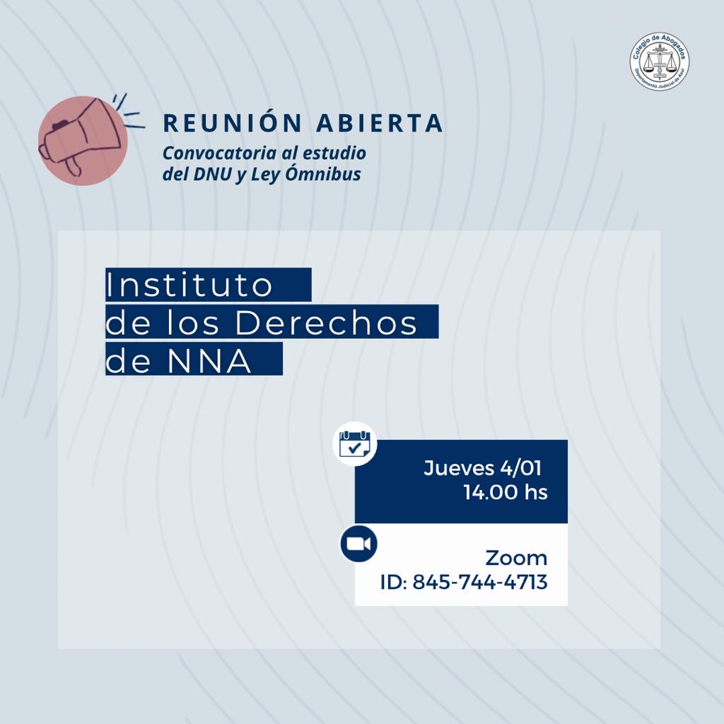 Instituto de Derechos de NNA: Jueves 4 de enero a las 14 horas Modalidad virtual mediante sistema Zoom. ID: 845 744 .4713