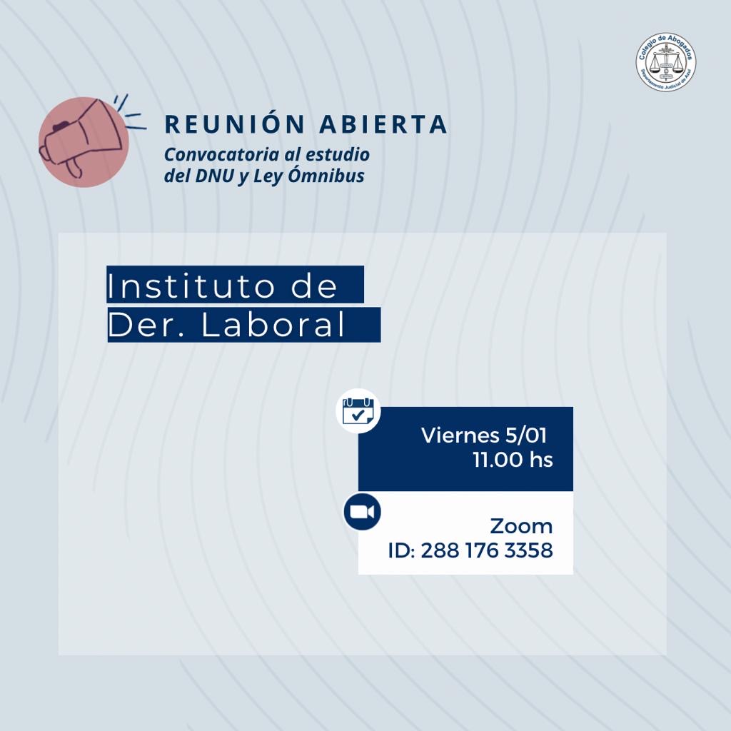 Instituto de Derecho Laboral: Viernes 5 de enero a las 11 horas Modalidad virtual mediante sistema Zoom. ID: 288 176 .3358