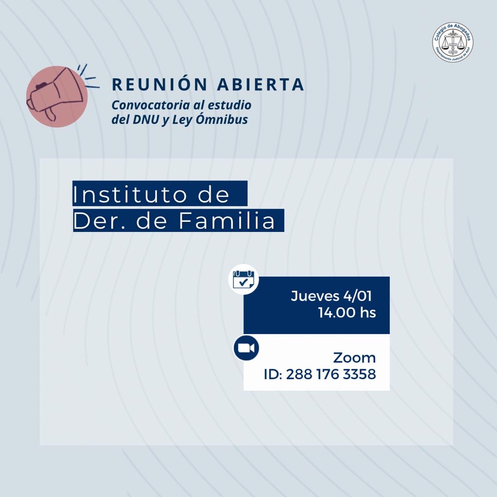 Instituto de Derecho de Familia: Jueves 4 de enero a las 14 horas Modalidad virtual mediante sistema Zoom. ID: 288 176 .3358