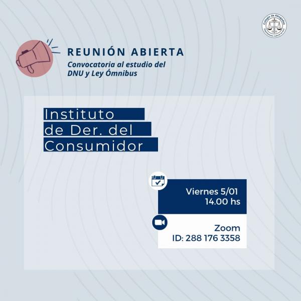 Instituto de Derecho del Consumidor: Viernes 5 de enero a las 14 horas Modalidad virtual mediante sistema Zoom. ID: 288 176 .3358