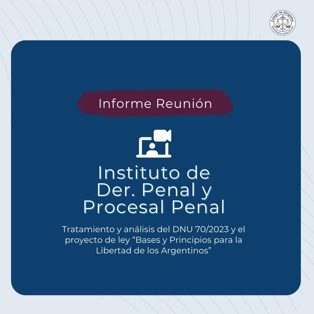Durante las primeras semanas de este mes, los Institutos Académicos del Colegio se reunieron a evaluar el impacto del DNU 70/2023 y el proyecto de ley "bases y principios para la libertad de los argentinos" presentados por el Ejecutivo Nacional en las distintas áreas del derecho. En cada encuentro se elaboró un documento que sintetizaba las consecuencias de dichas modificaciones. Compartimos a continuación el informe de la reunión del Instituto de Derecho Penal y Procesal Penal.