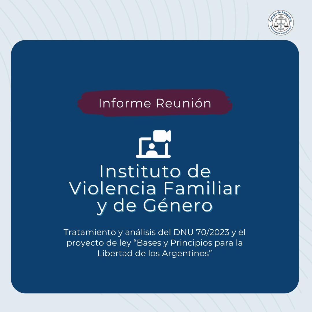 Durante las primeras semanas de este mes, los Institutos Académicos del Colegio se reunieron a evaluar el impacto del DNU 70/2023 y el proyecto de ley "bases y principios para la libertad de los argentinos" presentados por el Ejecutivo Nacional en las distintas áreas del derecho. En cada encuentro se elaboró un documento que sintetizaba las consecuencias de dichas modificaciones. Compartimos a continuación el informe de la reunión del Instituto de Violencia Familiar y de Género.