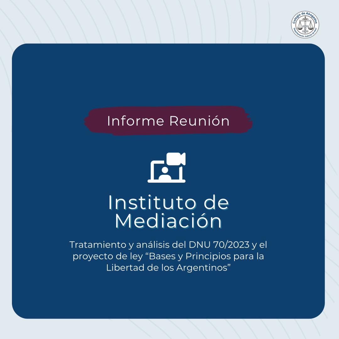 Durante las primeras semanas de este mes, los Institutos Académicos del Colegio se reunieron a evaluar el impacto del DNU 70/2023 y el proyecto de ley "bases y principios para la libertad de los argentinos" presentados por el Ejecutivo Nacional en las distintas áreas del derecho. En cada encuentro se elaboró un documento que sintetizaba las consecuencias de dichas modificaciones. Compartimos a continuación el informe de la reunión del Instituto de Mediación.