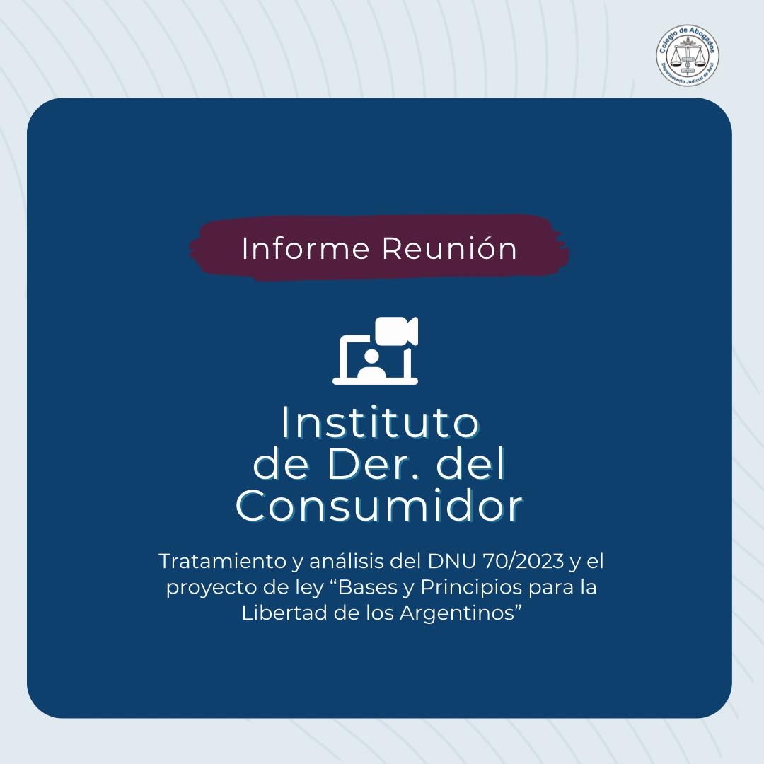 Durante las primeras semanas de este mes, los Institutos Académicos del Colegio se reunieron a evaluar el impacto del DNU 70/2023 y el proyecto de ley "bases y principios para la libertad de los argentinos" presentados por el Ejecutivo Nacional en las distintas áreas del derecho. En cada encuentro se elaboró un documento que sintetizaba las consecuencias de dichas modificaciones. Compartimos a continuación el informe de la reunión del Instituto de Derecho del Consumidor.
