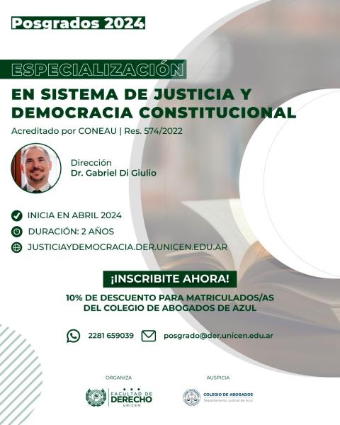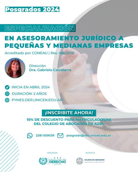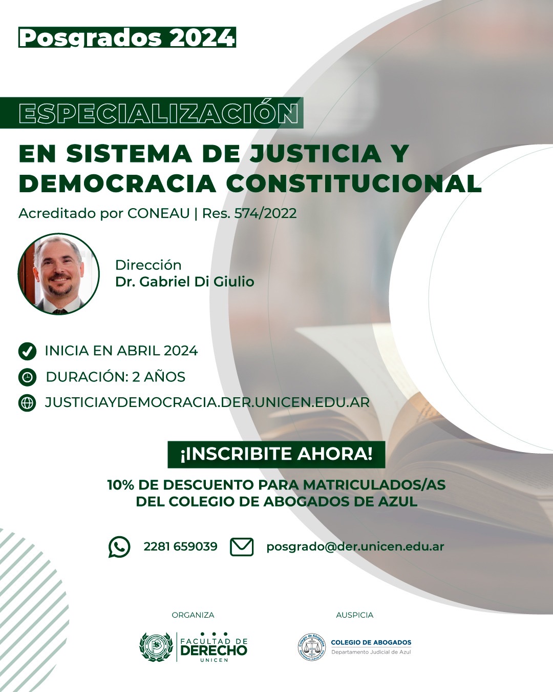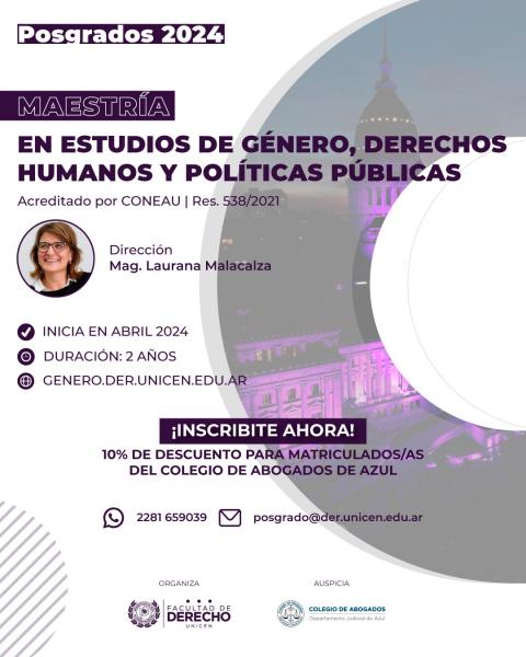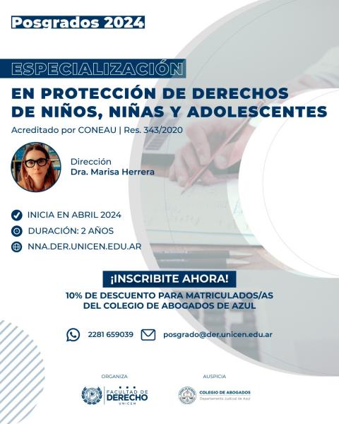 Continúa abierta la inscripción para la oferta de posgrados de la Facultad de Derecho de la UNICEN. Entre las propuestas, los matriculados y matriculadas pueden cuesar las siguientes especializaciones: Asesoramiento jurídico a pequeñas y medianas empresas; Proteccion de derechos de niñas, niños y adolescentes y Sistemas de justicia y democracia institucional. También pueden cursar la maestría en Estudios de género, derechos humanos y políticas públicas.