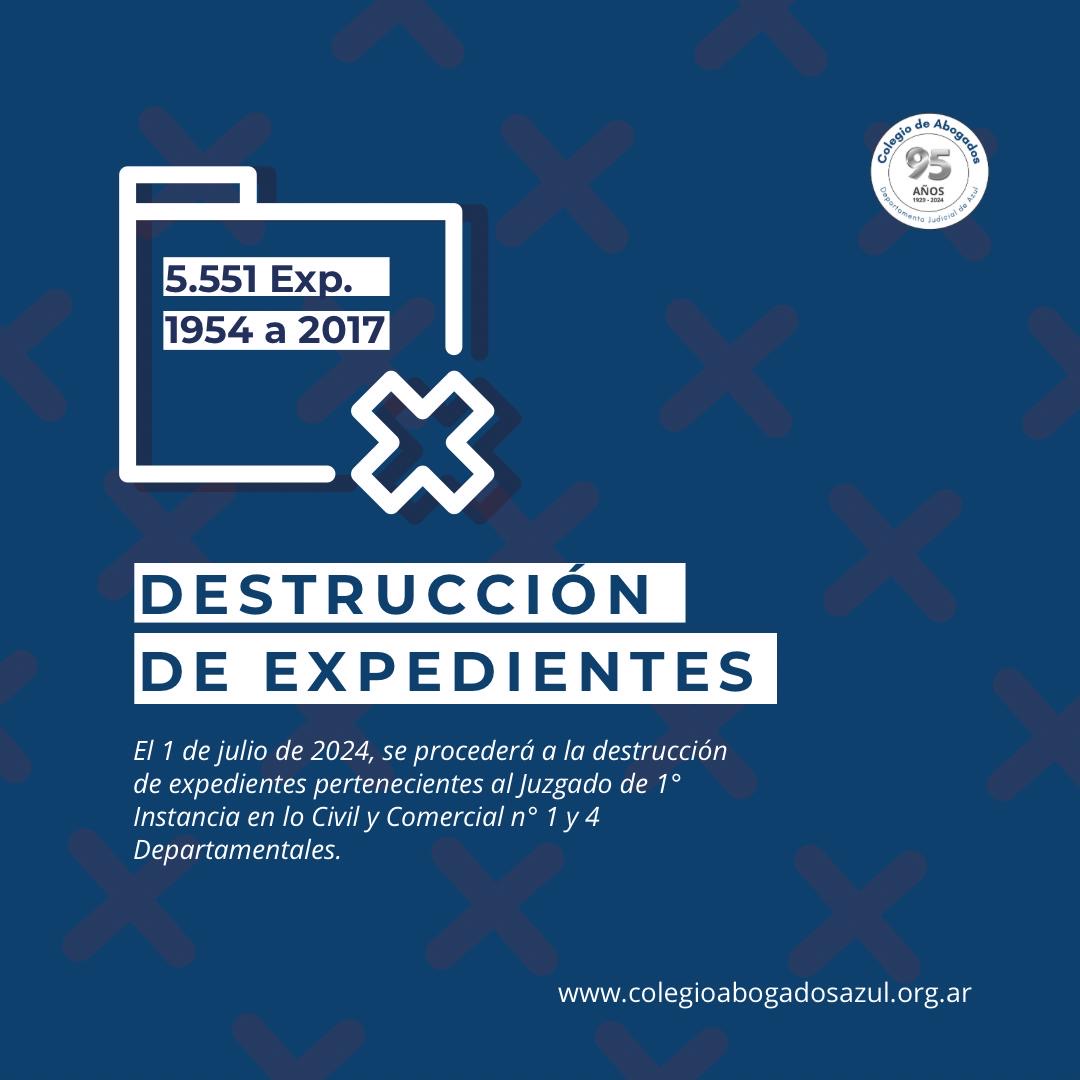 La nómina de Expedientes a destruir (artículo 119 del Acuerdo 3397/08) se encuentra a disposición de las/os interesadas/os en el Programa de Relevamiento, Organización y Destrucción de Expedientes del Departamento Judicial de Azul, en Av 25 de Mayo 884, Azul.