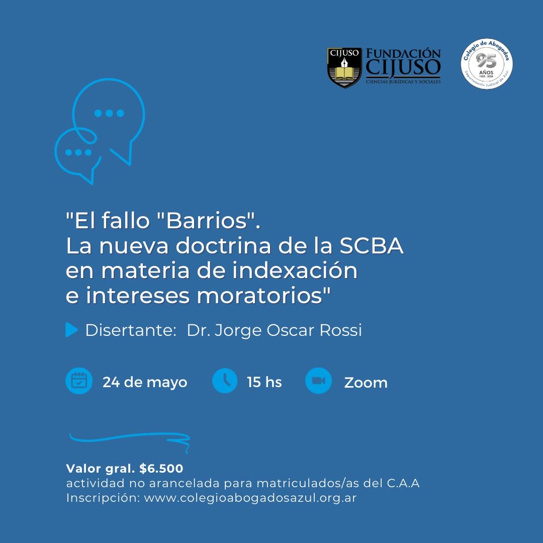 El encuentro fue organizado por el Colegio de Abogados Departamental en colaboración con la Fundación CIJUSO. Se realizará el viernes 24 de mayo a partir de las 15 hs en modalidad virtual y estará a cargo del Dr. Jorge Oscar Rossi.