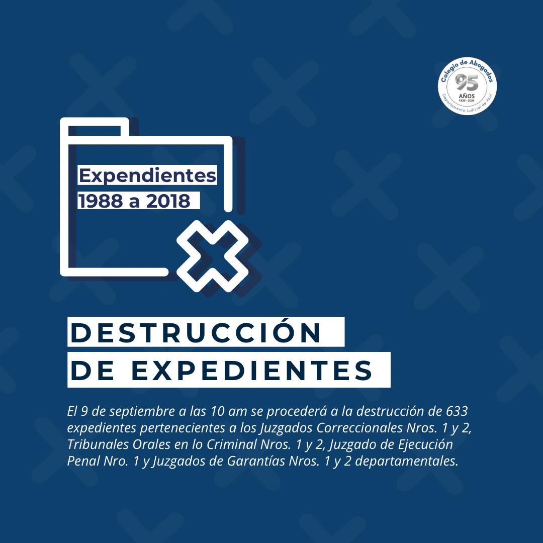 El 9 de septiembre a las 10 am se procederá a la destrucción de 633 causas iniciadas entre los años 1988 a 2018 con plazos de guarda vencidos. Se trata de de expedientes pertenecientes a los Juzgados Correccionales Nros. 1 y 2, Tribunales Orales en lo Criminal Nros. 1 y 2, Juzgado de Ejecución Penal Nro. 1 y Juzgados de Garantías Nros. 1 y 2 departamentales.