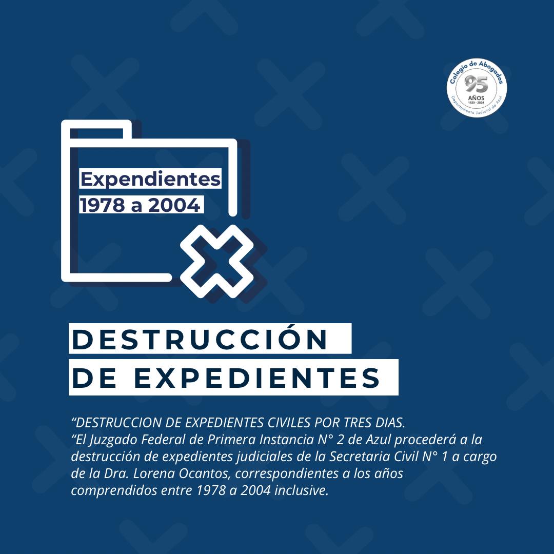 Se llevará a cabo una jornada de destruccion de expedientes civiles por tres días en los cuales se destruirán causas iniciadas entre los años 1978 a 2004 con plazos de guarda vencidos. Dichas causas corresponden a la Secretaría Civil Nro 1 del Juzgado Federal Nro 2 de Azul.