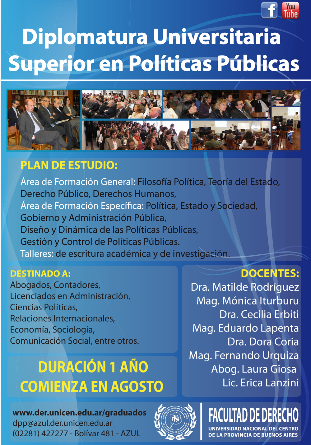 La Secretaría de Investigación y Posgrado de la Facultad de Derecho UNICEN informa que se encuentra abierta la inscripción para la Diplomatura Universitaria Superior en Políticas Públicas, de un año de duración, que ofrece un abordaje de las instituciones y la gobernabilidad, la gestión de políticas públicas y la administración gubernamental, propiciando una formación a la altura de los requerimientos de los momentos actuales.