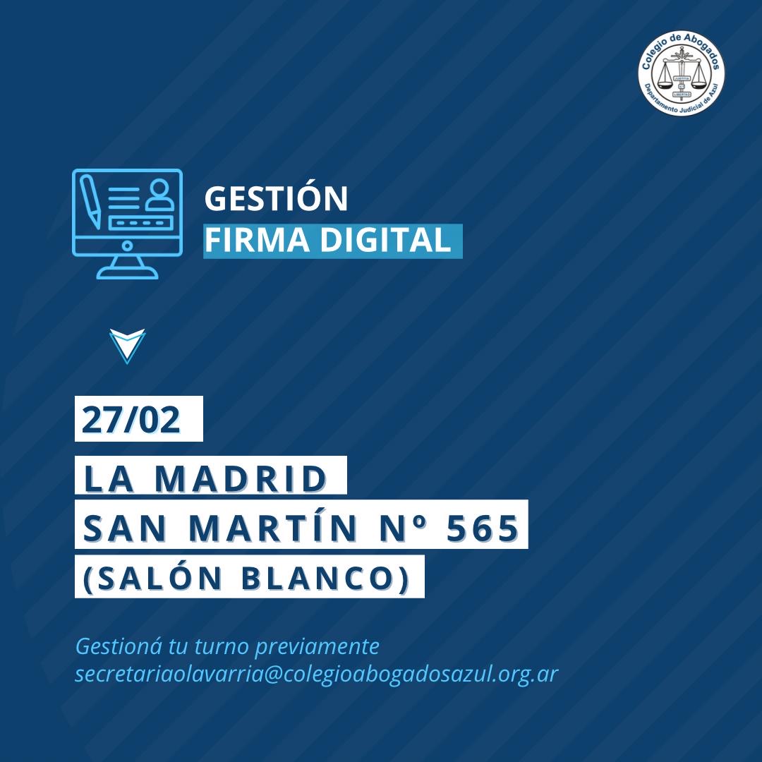 Personal del Colegio viajará a la localidad este 27 de febrero para facilitar la gestión de firma digital. Se solicita a matriculados y matriculadas que necesiten renovarla que saquen turno con antelación al correo: secretariaolavarria@colegioabogadosazul.org.ar