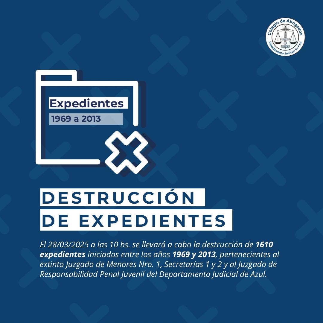 La nómina de expedientes a destruir se encuentra a disposición en el Archivo Departamental de Azul, ubicado en Av. 25 de Mayo 884.