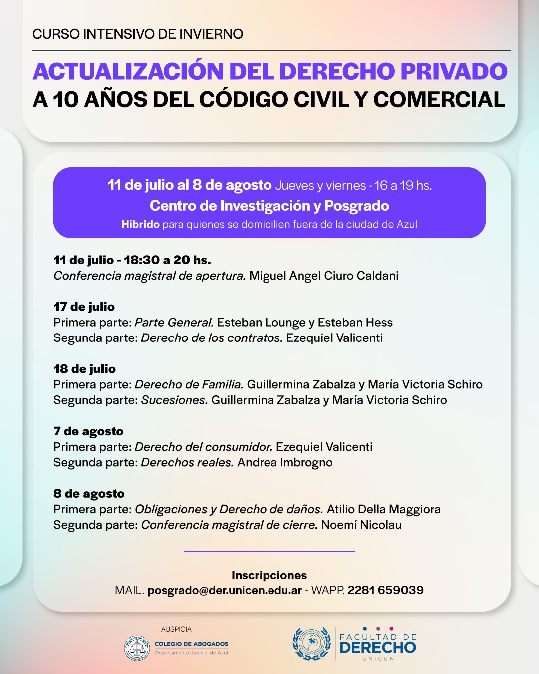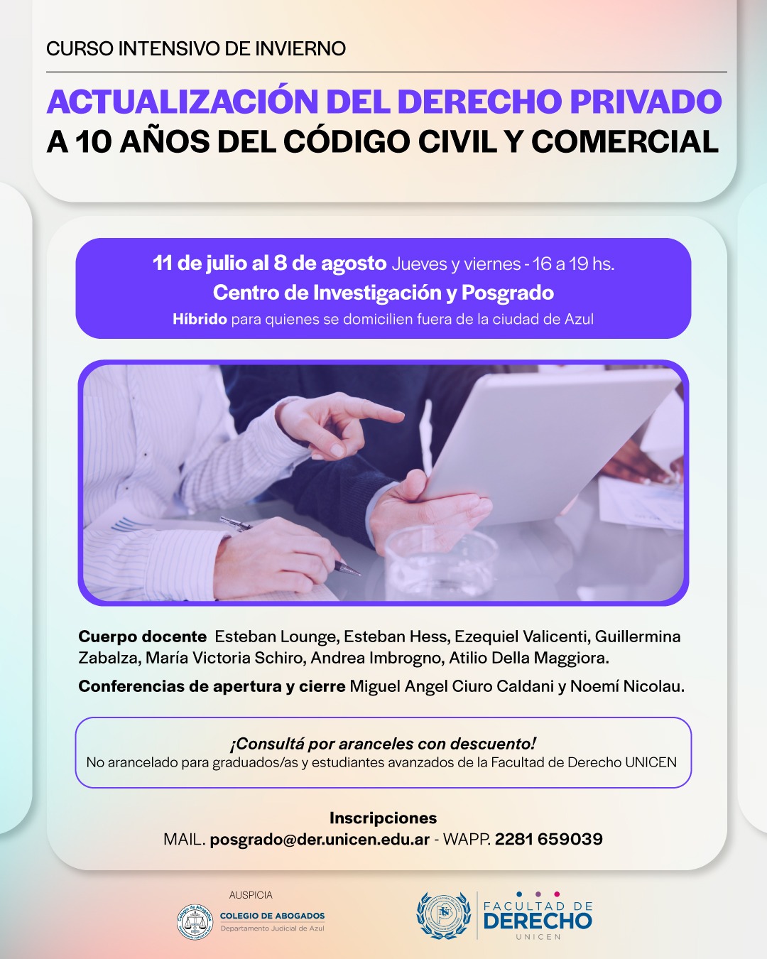 Se realizará del 11 de julio al 8 de agosto en el Centro de Investigacion y Posgrado de la Facultad de Derecho UNICEN. La modalidad es híbrida para quienes no vivan en Azul. Cabe destacar que matriculados/as del Colegio pueden inscribirse con descuento.