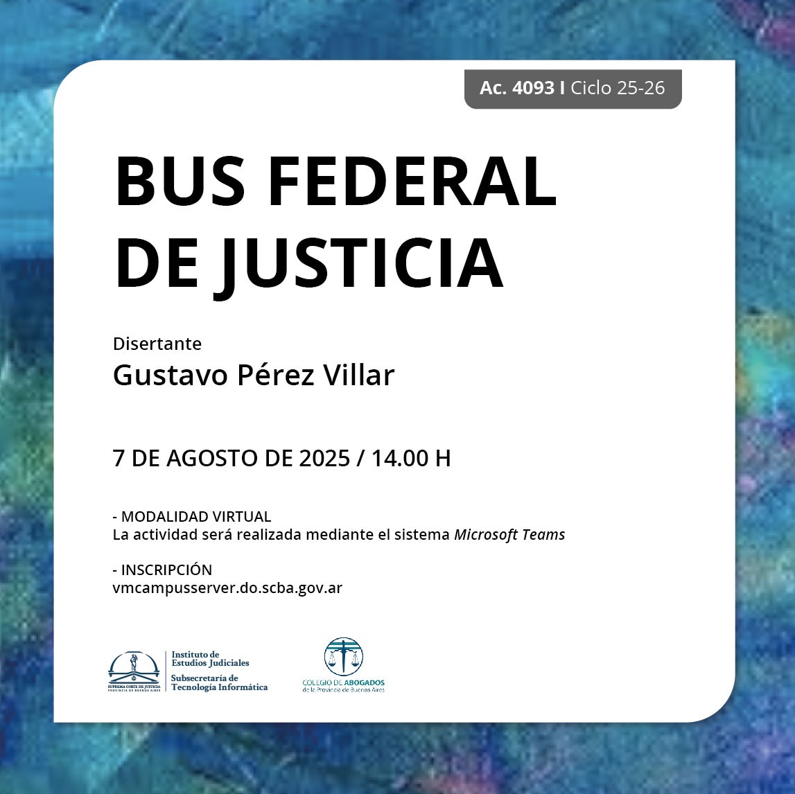 La propuesta se da a partir de la Res 1448/25 de la SCBA donde se aprobó la guía para diligenciamientos interjurisdiccionales que deban efectuarse hacia el Poder Judicial de la Provincia en el marco del Bus Federal de Justicia. Estará a cargo de Gustavo Pérez Villar y se realizará el 7 de agosto a las 14 hs en modalidad virtual.