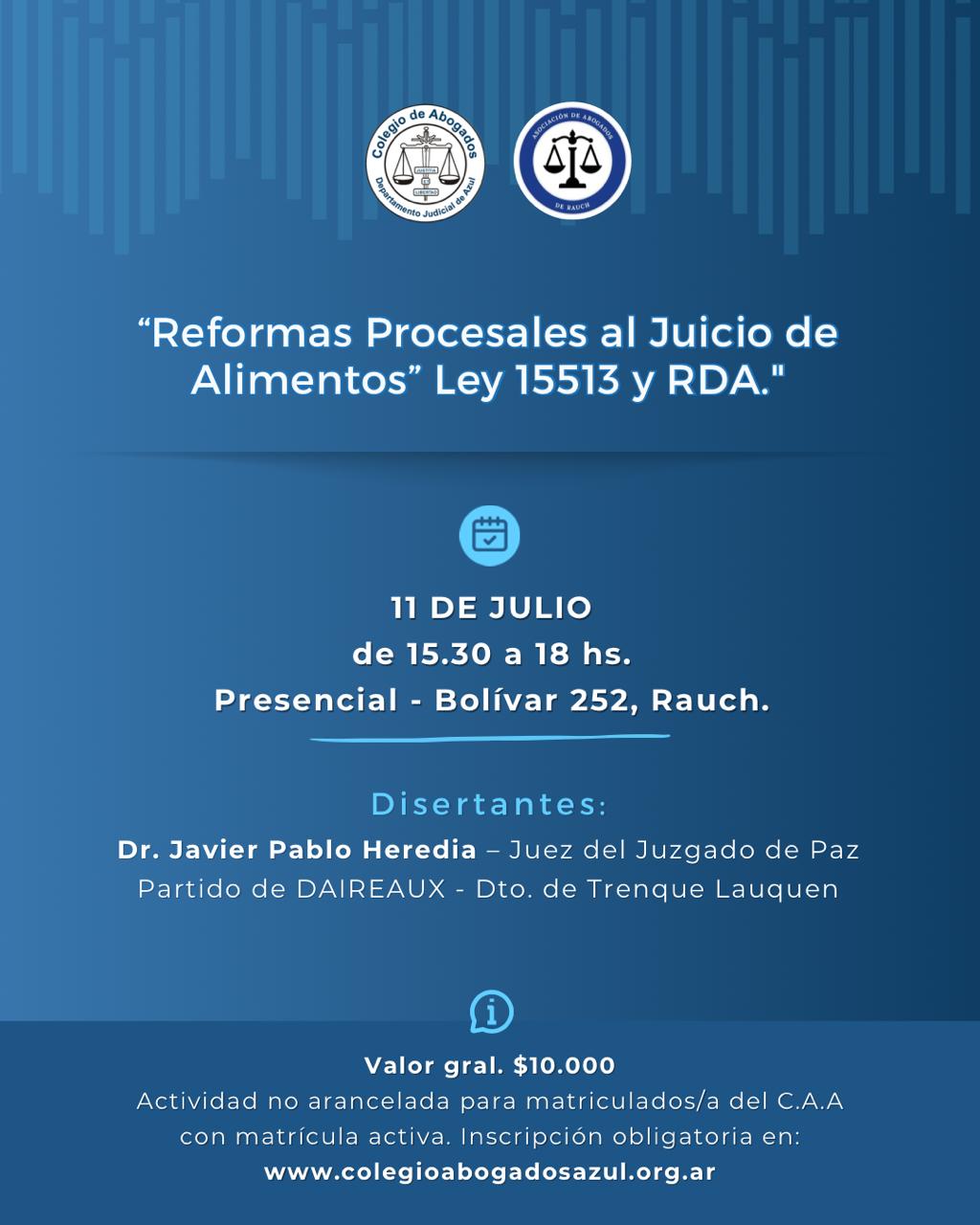 Quienes quieran participar deben inscribirse previamente aquí: https://colegioabogadosazul.org.ar/webinars/ver/262-reformas-procesales-al-juicio-de-alimentos-ley-15513-y-rda