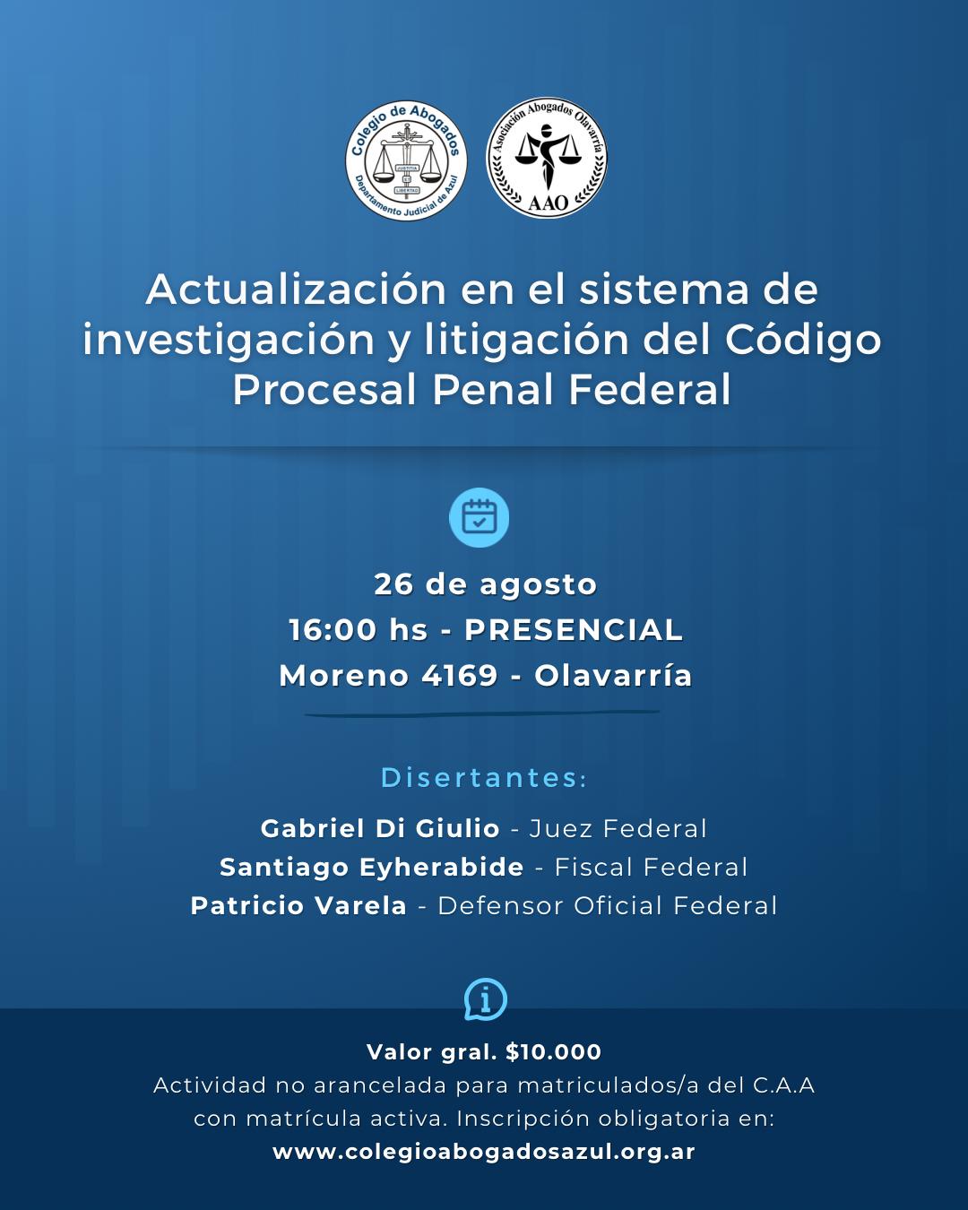 Quienes deseen participar deben inscribirse previamente en la actividad. Lo pueden hacer en el siguiente formulario: https://colegioabogadosazul.org.ar/webinars/ver/283-actualizacion-en-el-sistema-de-investigacion-y-litigacion-del-codigo-procesal-penal-federal
