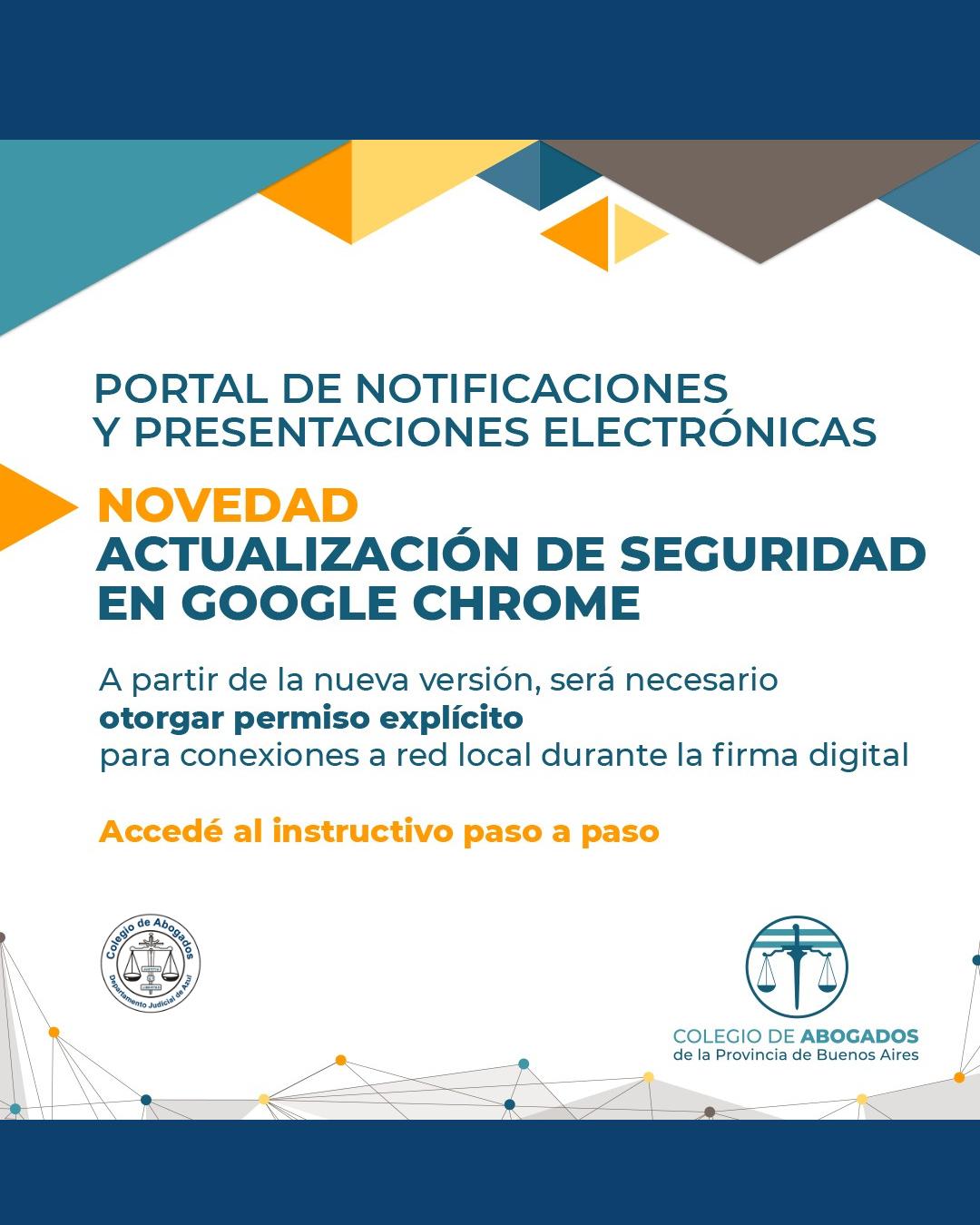 Cuando Chrome detecte que el sitio del Portal de Notificaciones y Presentaciones Electrónicas quiere interactuar con su red local (ya que al firmar digitalmente una presentación y sus documentos adjuntos, dicho Portal se comunica con el firmador instalado en su PC), mostrará un mensaje solicitando autorización donde usted deberá seleccionar la opción permitir.