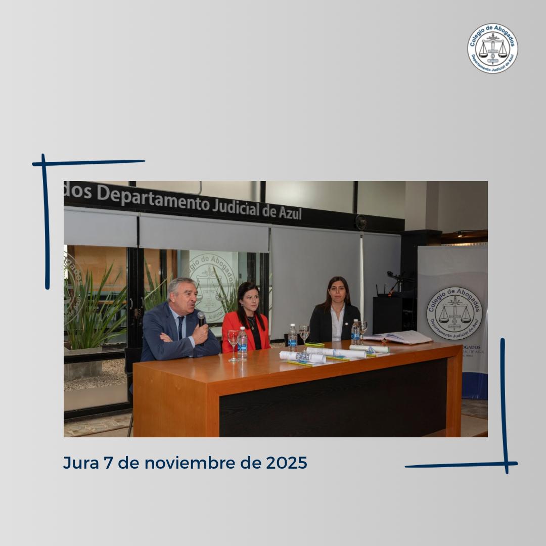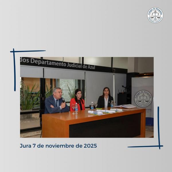 Este viernes al mediodía, en la sede del Colegio de Abogados de Azul, se realizó un nuevo acto de jura de profesionales que dio inicio formal a su ejercicio dentro de la abogacía. La ceremonia contó con la presencia de la presidenta del Colegio, Dra. María Fernanda Giménez; el vicepresidente primero, Dr. Marcelo Bianco; y la secretaria del Consejo Directivo, Dra. Romina Maineri, quienes dieron la bienvenida a los flamantes matriculados.