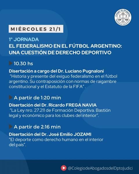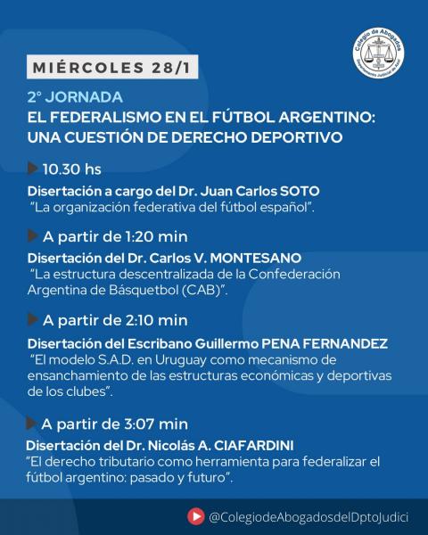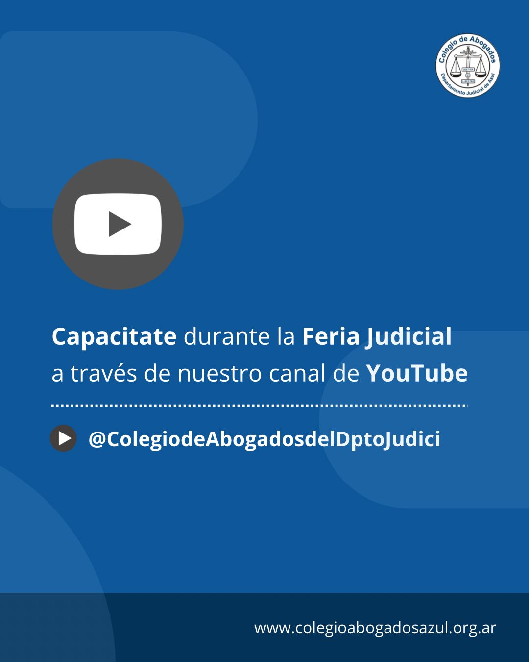 Tanto este miércoles como el miércoles 28 de enero podrán acceder a nuestro canal de YouTube, donde encontrarán cada disertación. Nos encuentran como @ColegioAbogadosdelDptoJudici