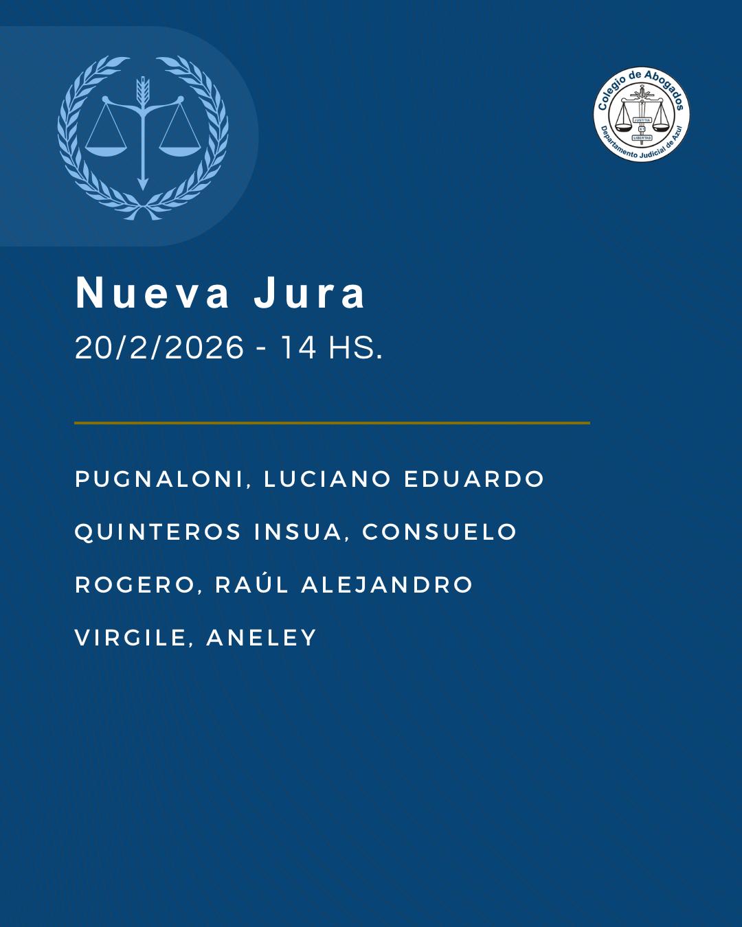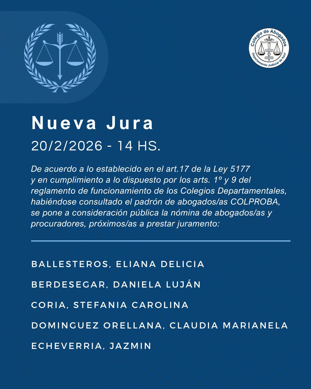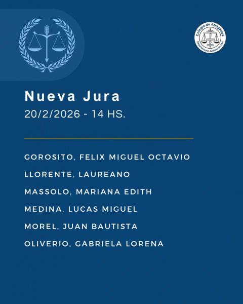 El próximo viernes 20 de febrero se realizará un nuevo acto de jura de matriculados/as en la sede de nuestro Colegio de Abogados Departamental. Desde las 14 hs las autoridades acompañarán a la nómina de profesionales que se pone a consideración pública.