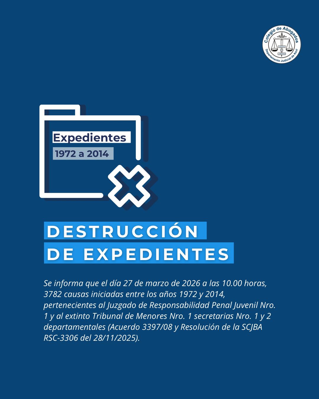 La nómina completa de expedientes a destruir se encuentra disponible para consulta en el Archivo Departamental Azul, ubicado en Av. 25 de Mayo 884.