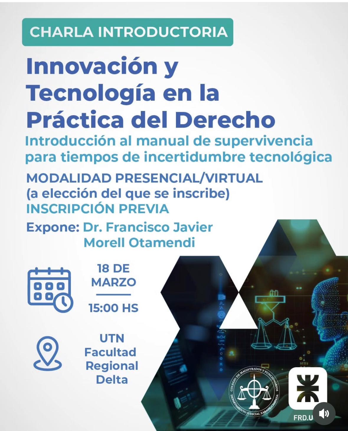 La exposición estará a cargo del Dr. Francisco Javier Morell Otamendi y se realizará el miércoles 18 de marzo a las 15 hs en modalidad híbrida. Para inscribirse, deberán completar el formulario disponible en el siguiente enlace: https://www.frd.utn.edu.ar/eventos/charla-introductoria-innovacion-y-tecnologia-en-la-practica-del-derecho/