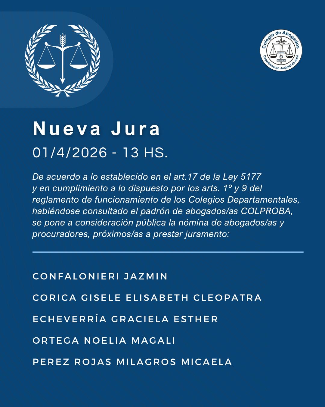 El próximo miércoles 1° de abril se realizará un nuevo acto de jura de matriculados/as en la sede de nuestro Colegio de Abogados Departamental. Desde las 13 hs las autoridades acompañarán a la nómina de profesionales que se pone a consideración pública.