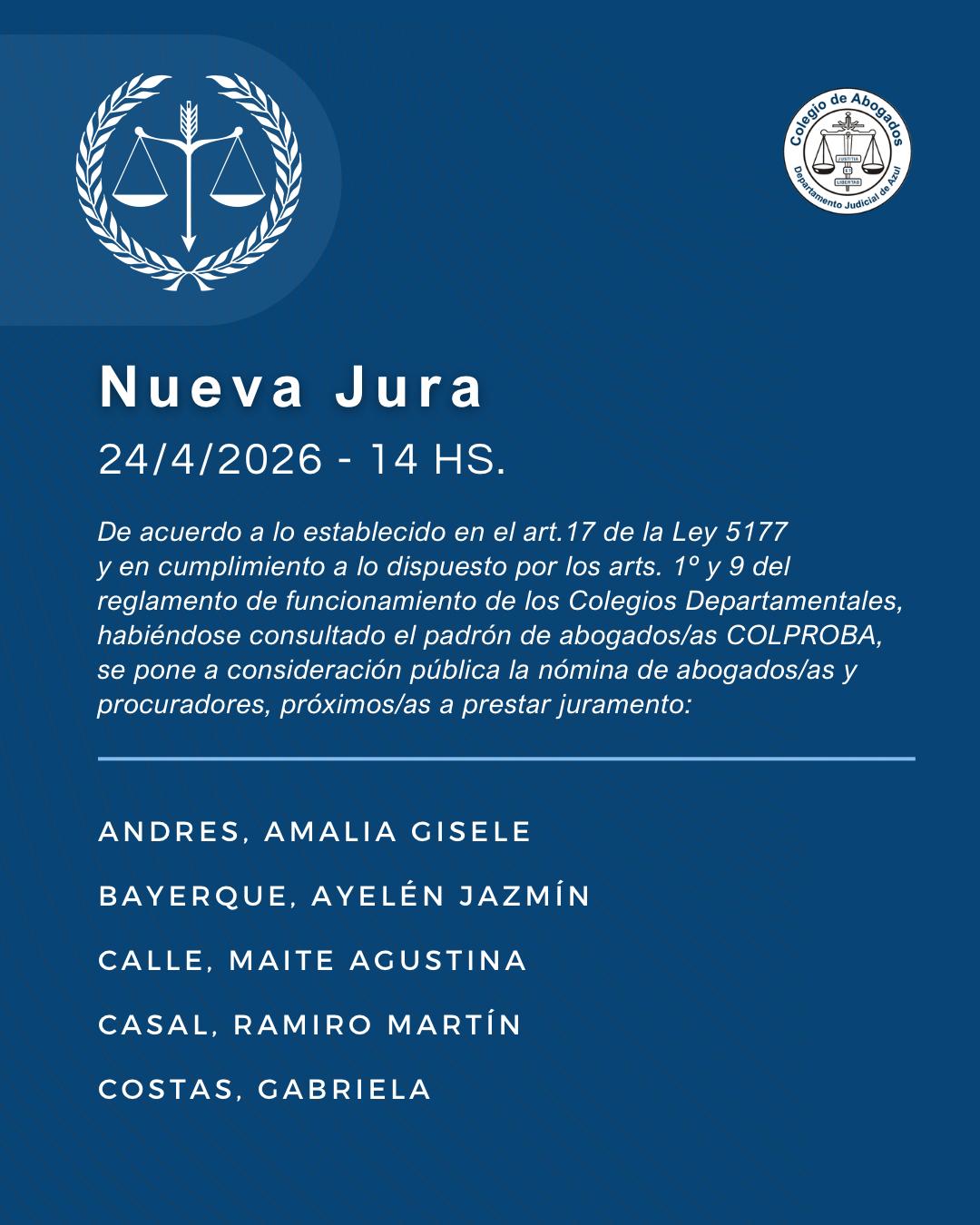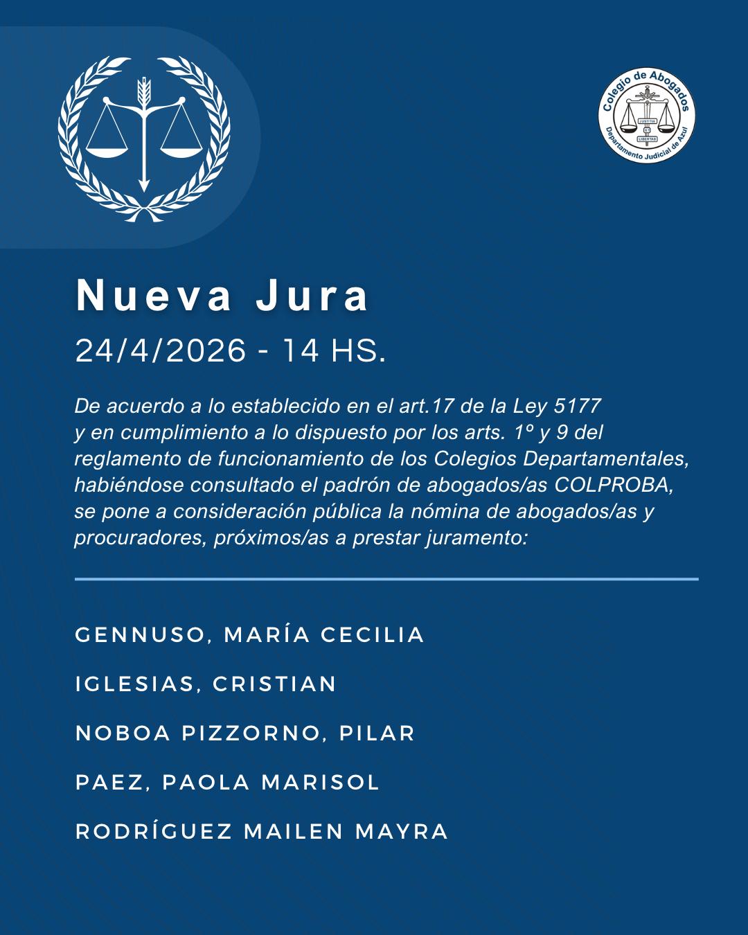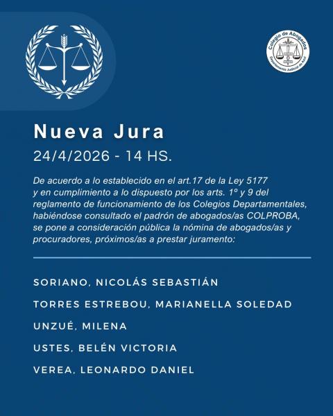 El próximo viernes 24 de abril se realizará un nuevo acto de jura de matriculados/as en la sede de nuestro Colegio de Abogados Departamental. Desde las 14 hs las autoridades acompañarán a la nómina de profesionales que se pone a consideración pública.