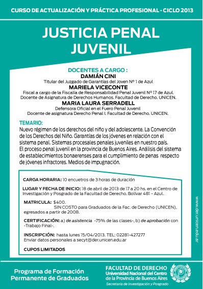 Matrícula: $400. Será SIN CARGO, para aquellos que se hayan graduado a partir de 2008 en la Facultad de Derecho (UNICEN).