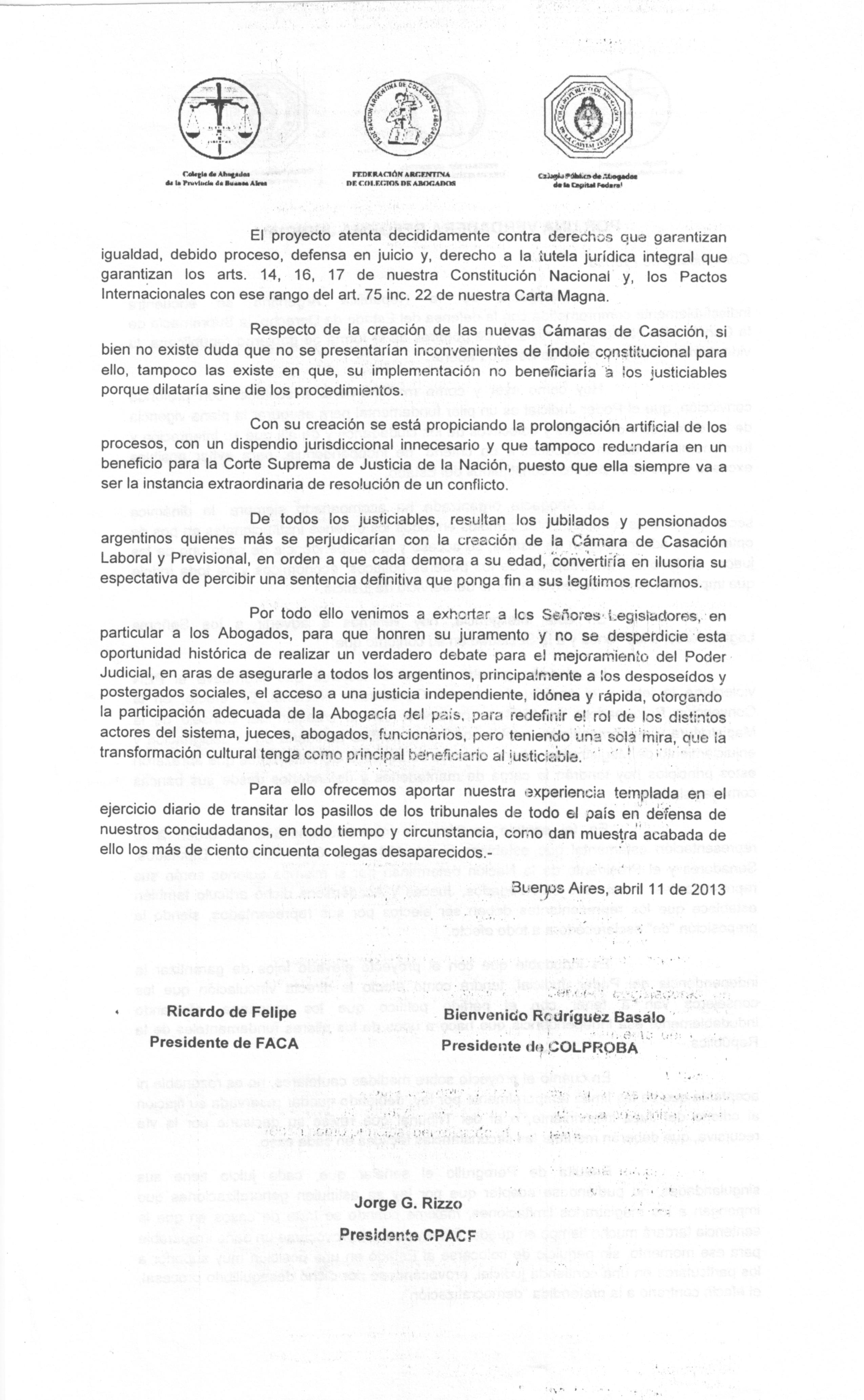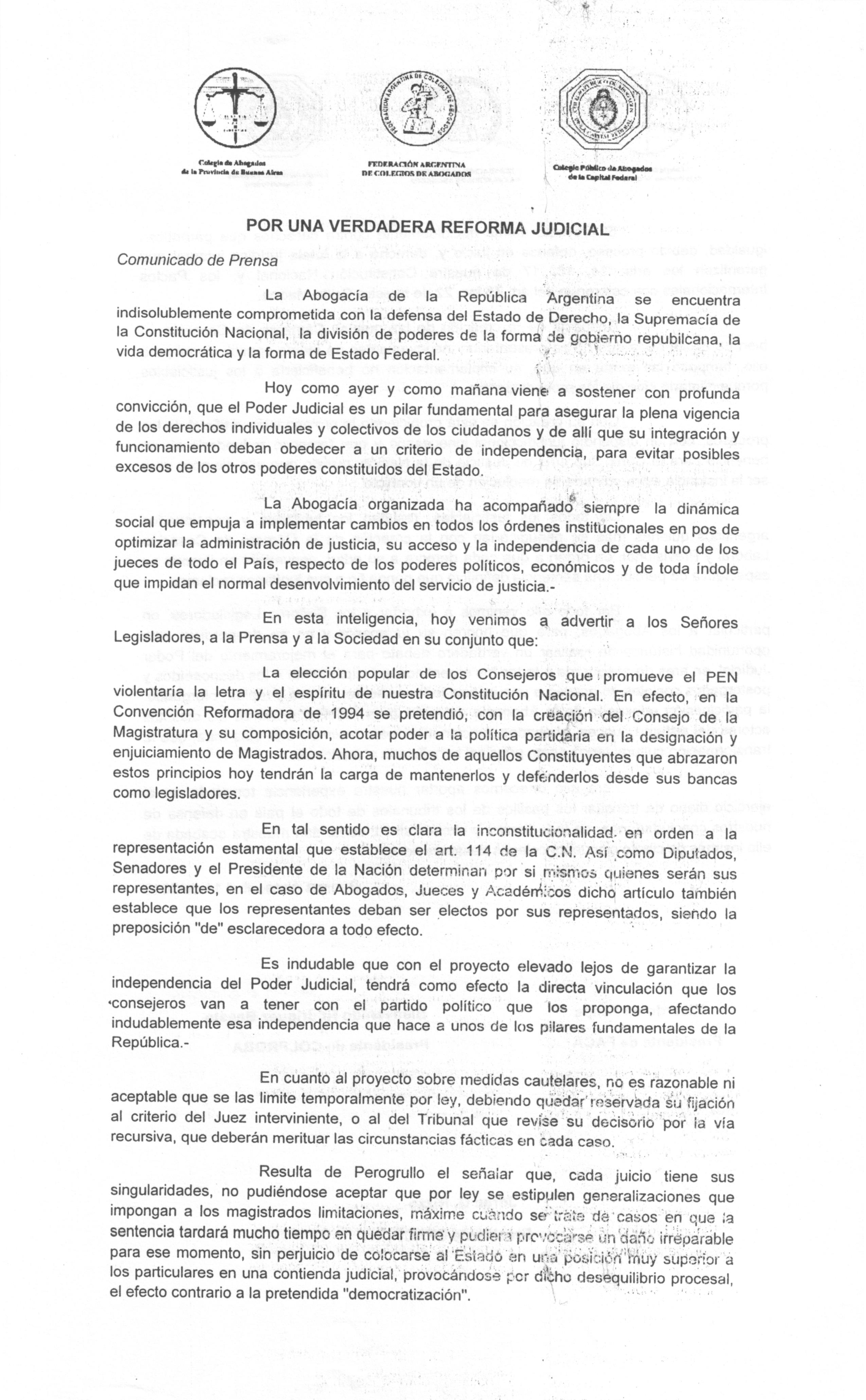 En una reunión y conferencia de prensa realizada en Capital Federal, los titulares del Colegio de Abogados de la pcia. de Buenos Aires, de la Federación Argentina de Colegio de Abogados y del Colegio Público de Abogados de Capital Federal, Bienvenido Rodriguez Basalo, Ricardo De Felipe y Jorge Rizzo respectivamente, representando a la abogacía argentina, dieron a conocer un duro comunicado relativo a la democratización de la justicia, llamado “ Por una verdadera reforma judicial” donde rechazaron las iniciativas de reformas al Consejo de la Magistratura, la limitación de las medidas cautelares y la creación de Cámaras de Casación que demoren causas que necesitan respuestas urgentes, como el caso de los jubilados.