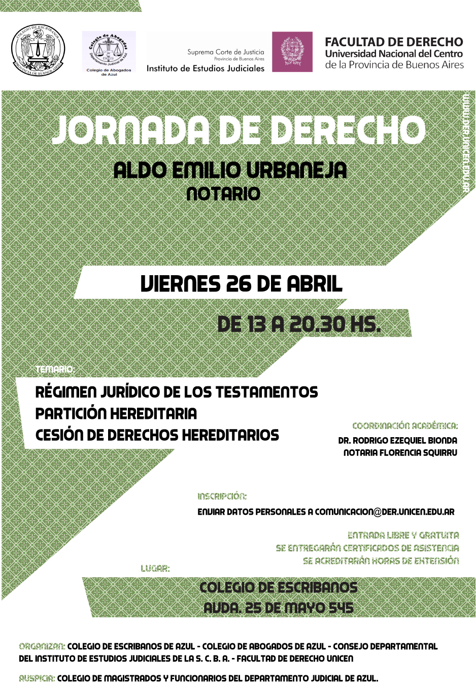 El viernes 26 de abril se realizará en el Colegio de Escribanos de Azul -Av. 25 de Mayo 545- en el horario 13 a 20.30 hs. una Jornada de Derecho a cargo del Notario Aldo Emilio Urbaneja, cuyos temas a tratar serán el Régimen Jurídico de los testamentos, partición hereditaria y cesión de derechos hereditarios. A su vez, se dará tratamiento de estos temas de acuerdo a las normas vigentes en el código civil actual y en paralelo los cambios que puedan surgir de aprobarse el nuevo código.