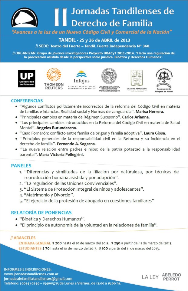 Las 2º Jornadas Tandilenses de Derecho de Familia “Avances a la luz de un Nuevo Código Civil y Comercial de la Nación” se llevarán a cabo los días 25 y 26 de abril próximo en el Teatro del Fuerte de Tandil (Fuerte Independencia Nº 360).