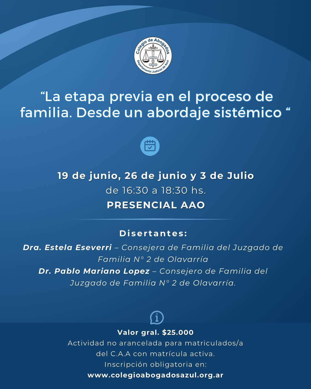 “La etapa previa en el proceso de familia. Desde un abordaje sistémico “. Jueves .03 .07 25, de 16:30 a 18:30 horas . Inscripción cerrada. . El Colegio de Abogados del Departamento Judicial de Azul ha organizado una capacitación sobre “La etapa previa en el proceso de familia. Desde un abordaje sistémico“ a cargo de la Dra. ESTELA ESEVERRI – Consejera de Familia del Juzgado de Familia N° 2 de Olavarría y del            Dr.  PABLO MARIANO LOPEZ – Consejero de Familia del Juzgado de Familia N° 2 de Olavarría. El curso contara de tres encuentros, previstos para los días 19  y 26 de Junio y 3 de julio de 2025, en el horario de 16:30 a 18:30 horas ; los mismos serán encuentros PRESENCIALES, y se desarrollaran en la Sede Olavarría, del Colegio de Abogados de Azul. las y los interesadas/os deberán inscribirse previamente en la página web del Colegio. La capacitación será no arancelada para matriculadas y matriculados del Colegio de Abogados del Departamento Judicial de Azul, con matrícula activa. Entrada general: .25 000 pesos .