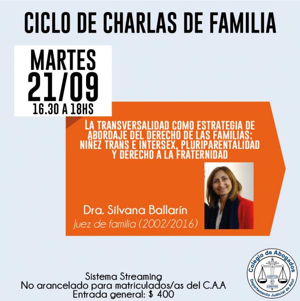 La Dra. Silvana Ballarin estará a cargo de la cuarta charla del CICLO DE FAMILIA, la cual se ha programado para el día martes 21 de septiembre las 16.30 horas y se llevará a cabo de manera virtual mediante sistema streaming, manteniéndose abierta la inscripción hasta el día de la actividad a las 14 horas.