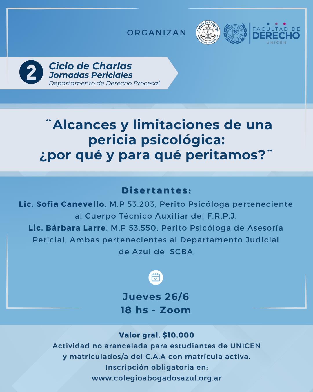 El Colegio de Abogados del Departamento Judicial de Azul y la Facultad de Derecho de la UNICEN han organizado un Ciclo de Charlas de la Asesoría Pericial del Dpto. Judicial de Azul.