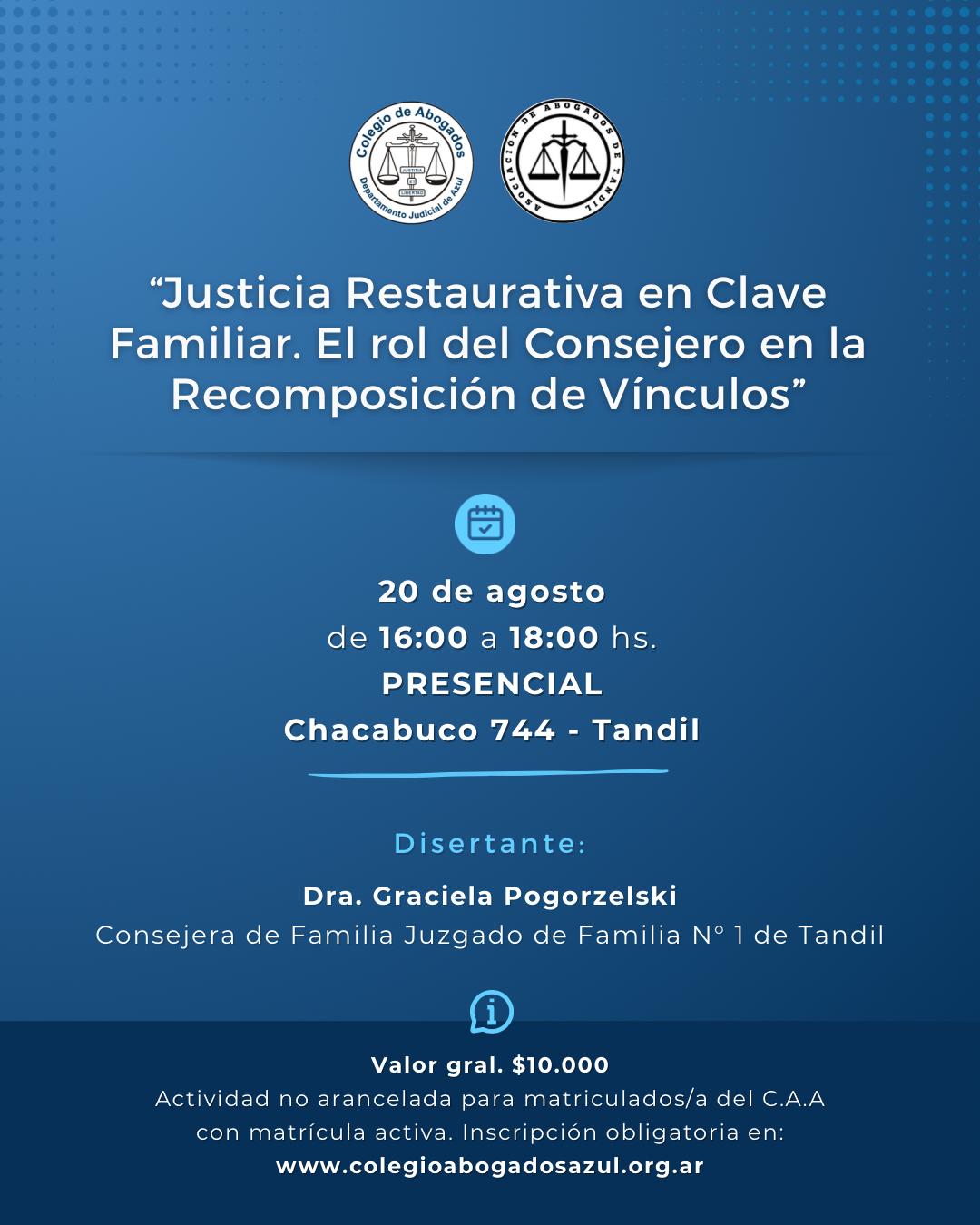 El Colegio de Abogados del Departamento Judicial de Azul ha organizado una capacitación sobre “Justicia Restaurativa en Clave Familiar. El rol del Consejero en la Recomposición de Vínculos”