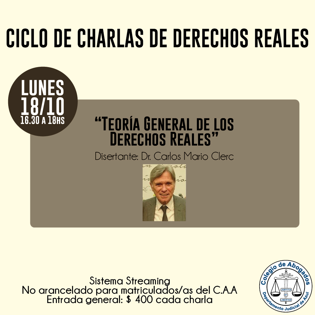 Continuando con el CICLO DE CHARLAS DE DERECHOS REALES, el Dr. CARLOS MARIO CLERC, disertará el día 18 de octubre, a las 16.30 horas sobre: Teoría General de los Derechos Reales.