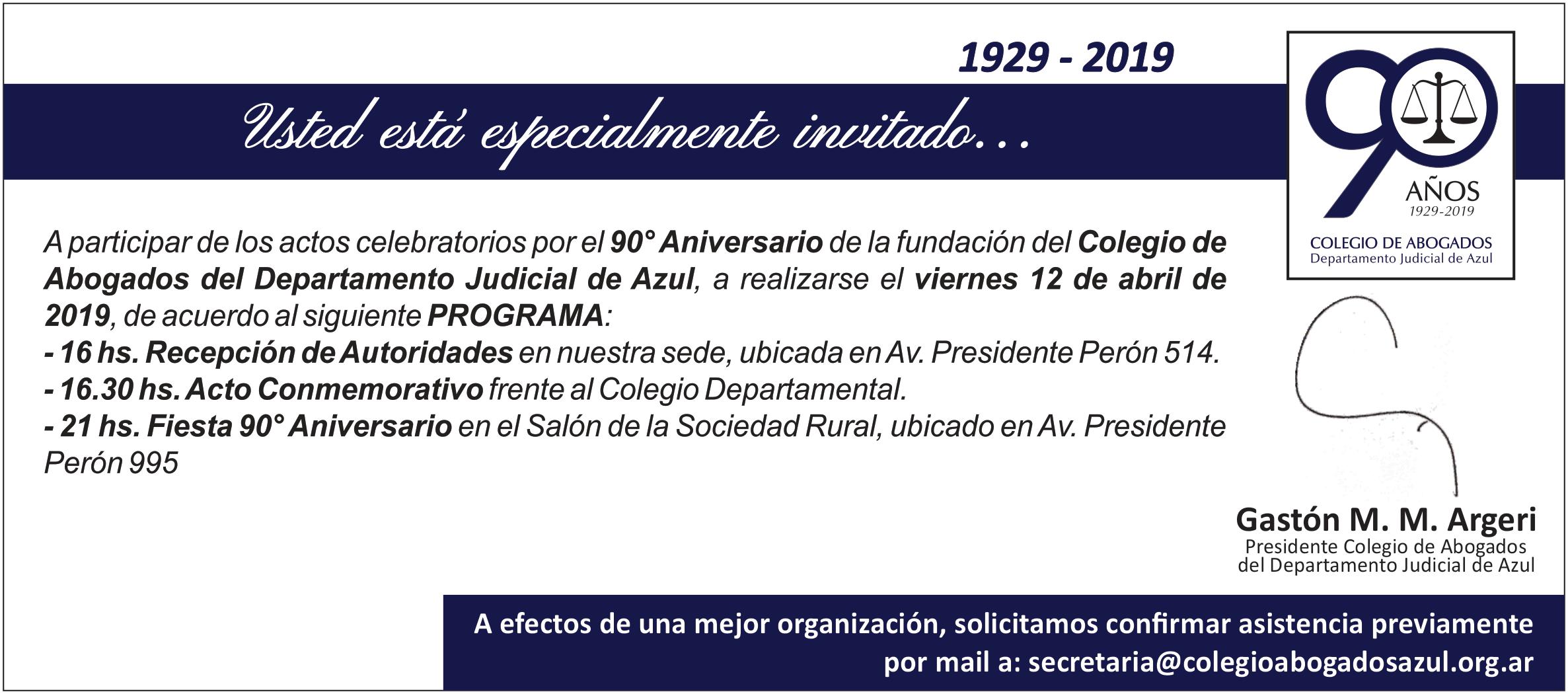 Este año es muy importante para el Colegio de Abogados del Departamento Judicial de Azul, por eso te invitamos a participar de todas las actividades que se realizarán en el marco del 90° Aniversario de su fundación y principalmente, de los actos celebratorios que se realizarán el próximo viernes 12 de abril.