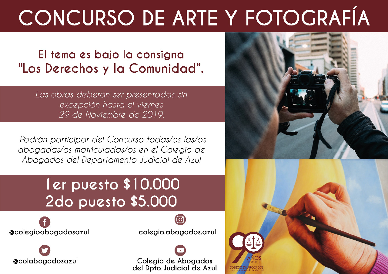 El Colegio de Abogados del Departamento Judicial de Azul invita a todas/os sus matriculadas/os a sumarse al concurso de Arte y Fotografia. La iniciativa se impulsa bajo la consigna "Los Derechos y la Comunidad”. Las obras deberán ser presentadas sin excepción hasta hoy, viernes 29 de Noviembre de 2019.