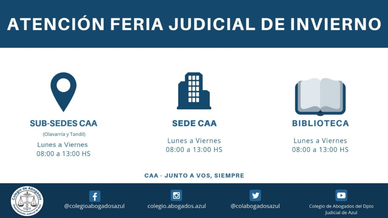 Desde el 22 de julio al 2 de agosto inclusive el horario de atención en la sede del Colegio Departamental de Azul, así como también en las subsedes de Tandil y Olavarría, será de lunes a viernes de 8 a 13hs.