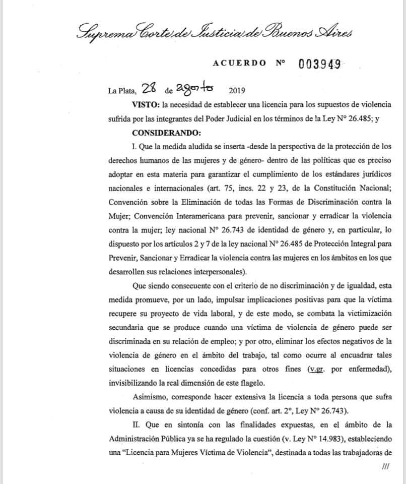 La Suprema Corte de Justicia de Buenos Aires aprobó por unanimidad el Acuerdo 3449 que incorpora la licencia por Violencia de Género al articulado del Estatuto del Agente Judicial.