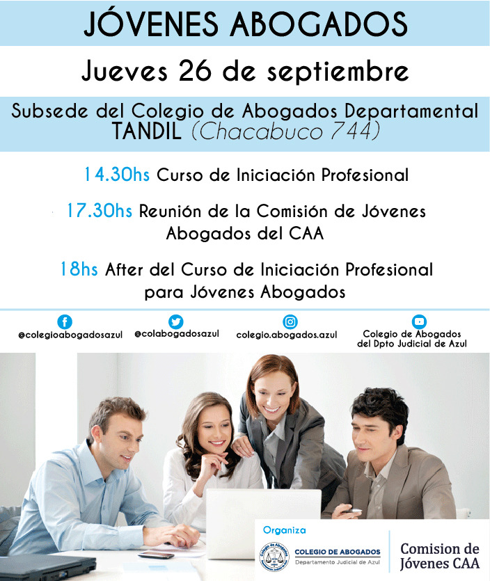 El próximo jueves 26 de septiembre en Tandil y el viernes 22 de noviembre en Olavarría se concretarán reuniones de trabajo y encuentros de camaradería que fortalecen la tarea de la Abogacía Joven del Departamento Judicial de Azul, por ello invitamos especialmente a las abogadas y abogados, de todas las localidades, a participar de estas iniciativas. Consultas: jovenesabogados@colegioabogadosazul.org.ar