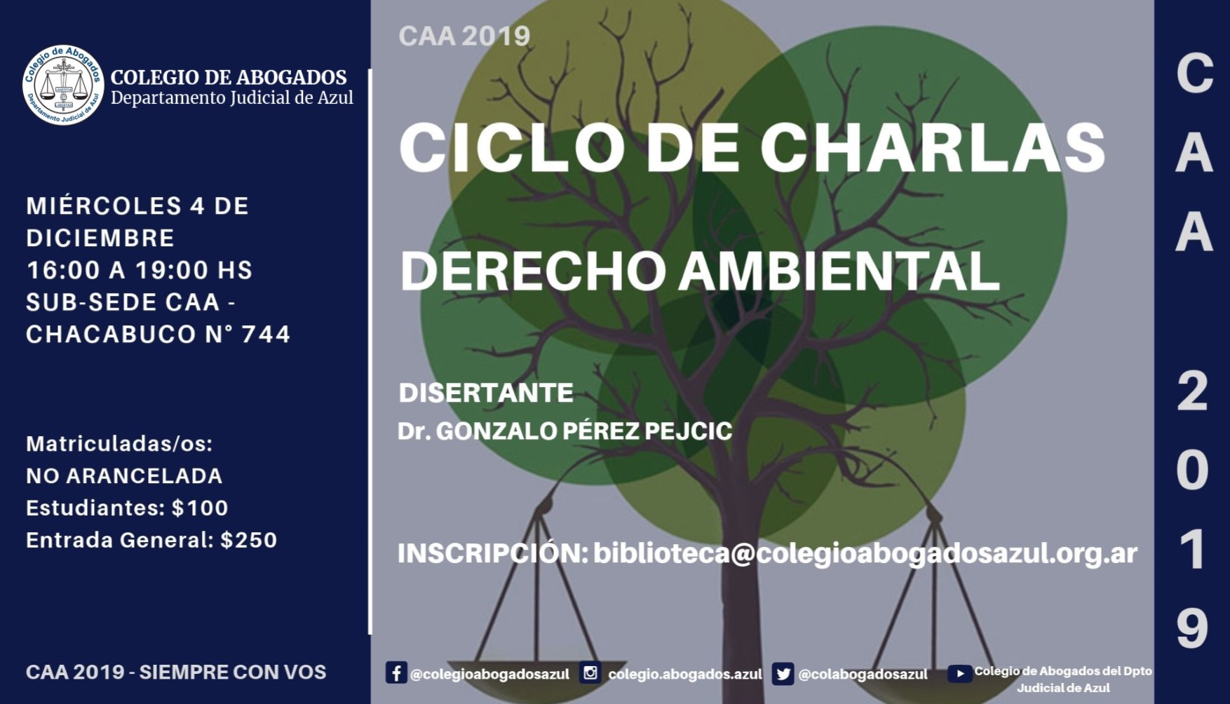 El Dr. Gonzalo Pérez Pejcic disertará, en el marco del Ciclo de Charlas “Derechos Reales, Derecho Ambiental y Derecho Animal”, este miércoles 4 de diciembre de 16 a 19hs, en la subsede de Tandil (Chacabuco 744). Inscripciones por mail a: biblioteca@colegioabogadosazul.org.ar