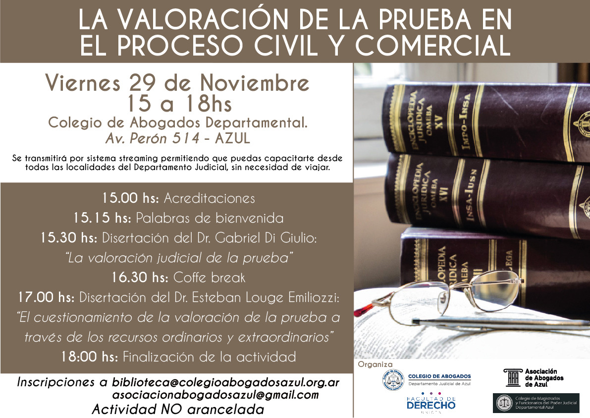 Esta jornada no arancelada, será transmitida por sistema streaming para que abogadas y abogados puedan capacitarse desde todas las localidades del Departamento Judicial, sin necesidad de viajar. Inscripciones por mail a: asociacionabogadosazul@gmail.com / biblioteca@colegioabogadosazul.org.ar