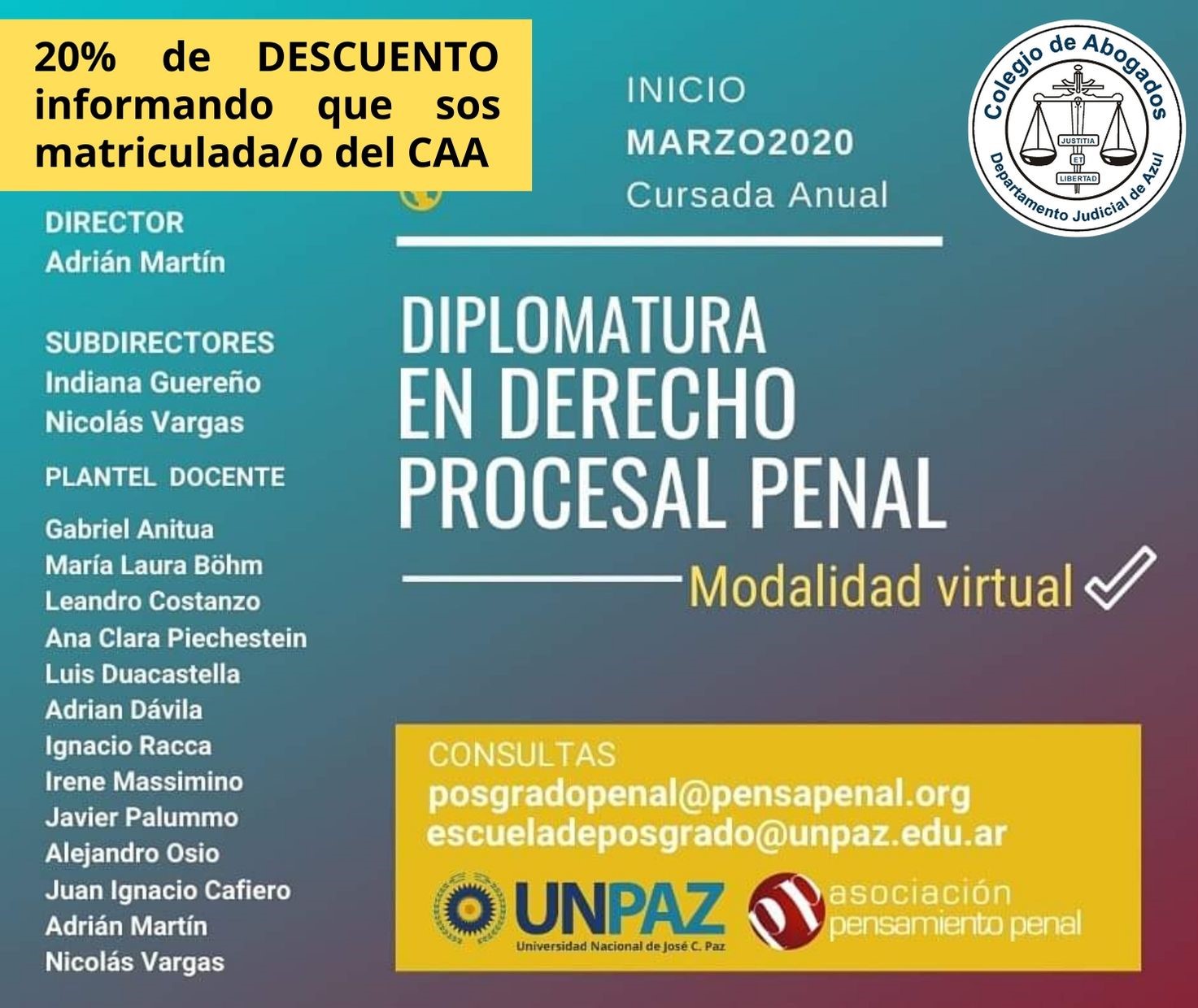 Informando que sos matriculada/matriculado del CAA, obtendrás un 20% de descuento en esta especialización de modalidad virtual, dictada por la Universidad Nacional de José C. Paz (UNPAZ) y la Asociación de Pensamiento Penal (APP) que inicia en marzo. Consultas e inscripciones: posgradopenal@pensapenal.org / escueladeposgrado@unpaz.edu.ar