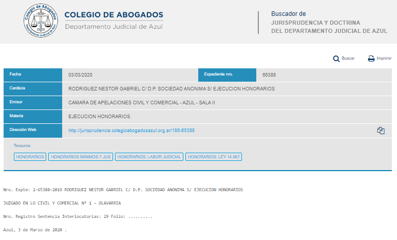 Con fecha 03 de marzo de 2020, la Sala II de la Excma. Cámara de Apelación en lo Civil y Comercial de Azul dictó sentencia interlocutoria en la causa “R. N. G. C/ D.P. SOCIEDAD ANONIMA S/ EJECUCION HONORARIOS” (2-65388-2019) en materia de honorarios, elevando los honorarios regulados en primera instancia, adecuandose al minimo que establece la Ley 14.967. "Analizadas las actuaciones, en atención al valor y mérito de los trabajos realizados en autos, al tipo de proceso, y a lo dispuesto por los arts. 1, 10, 16, 22 de la Ley 14.967, corresponde modificar, la regulación de honorarios del Dr. N. G. R., fijándolos en la suma equivalente a 7 (siete) jus arancelarios"